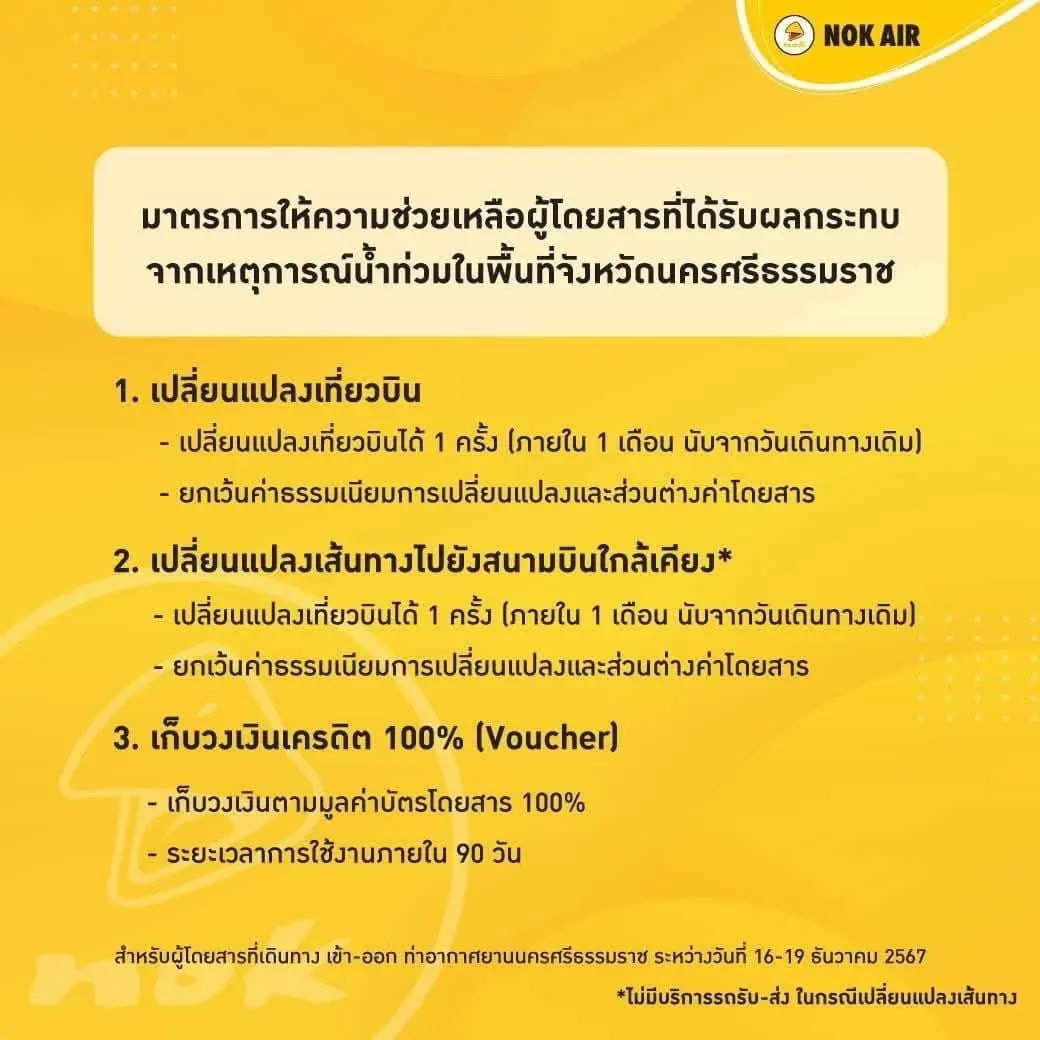 -สายการบิน Nok Air ประกาศมาตรการให้ความช่วยเหลือผู้โดยสารที่ได้รับผลกระทบจากสถานการณ์น้ำท่วมในพื้นที่จังหวัดนครศรีธรรมราช ดังต่อไปนี้