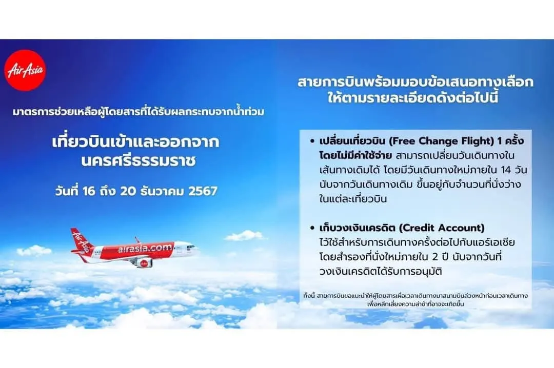 -สายการบิน Air Asia ประกาศมาตรการให้ความช่วยเหลือผู้โดยสารที่ได้รับผลกระทบจากสถานการณ์น้ำท่วมในพื้นที่จังหวัดนครศรีธรรมราช ดังต่อไปนี้