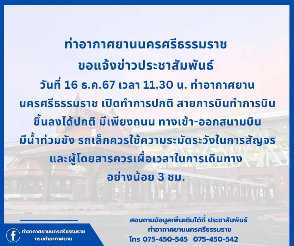 ประกาศ 📢 ท่าอากาศยานนครศรีธรรมราช แจ้งข่าวประชาสัมพันธ์ วันที่ 16 ธันวาคม 2567 สายการบินทำการบินขึ้น-ลงได้ตามปกติ มีเพียงน้ำท่วมขังบริเวณถนนทางเข้า-ออกสนามบิน รถเล็กควรใช้ความระมัดระวังในการสัญจร ผู้ที่มีความประสงค์จะเดินทาง ควรเผื่อเวลาในการเดินทางอย่างน้อย 3 ชั่วโมง✈️✈️