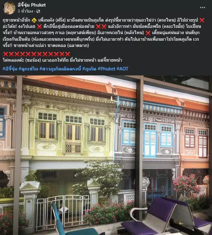 กูขายหน้าอิ่ชัก 🚸 เพื่อนผัง (ฝรั่ง) มาถึงสนามบินภูเก็ต ส่งรูปนี้มาถามว่ายุแถวไน่ว่า (ตรงไหน) มั่นอิไปถ่ายรูป ❌ อ่ะโต้ย! งงไปเลย ❌ อีนี้อยู่เมืองลอดช่องม้าย ❌ แล้วอิการท่า มั่นช้อตอื้อพรืย (งงอะไรมั้ย)!! บ้านเรามอหลาวสวยๆ กาเอ (คฤหาสน์เพียบ) อิเอาหนวยไน่ (จะเอาหลังไหน) ❌ เตี้ยมฉู่แค่น่นล่าง น่นดีบุกเรียงกันเป็นตับ (ห้องแถวถนนถลางถนนดีบุกพรึ่บ) ❌ มึ่งไม่เอามาทำ ดันไปเอาบ้านเพื่อนมาโปรโมตภูเก็ต ❌ เวรจริ้ง!! ขายหน้าเค่าเปล่า ชาดเหลอ (ฉลาดมาก)