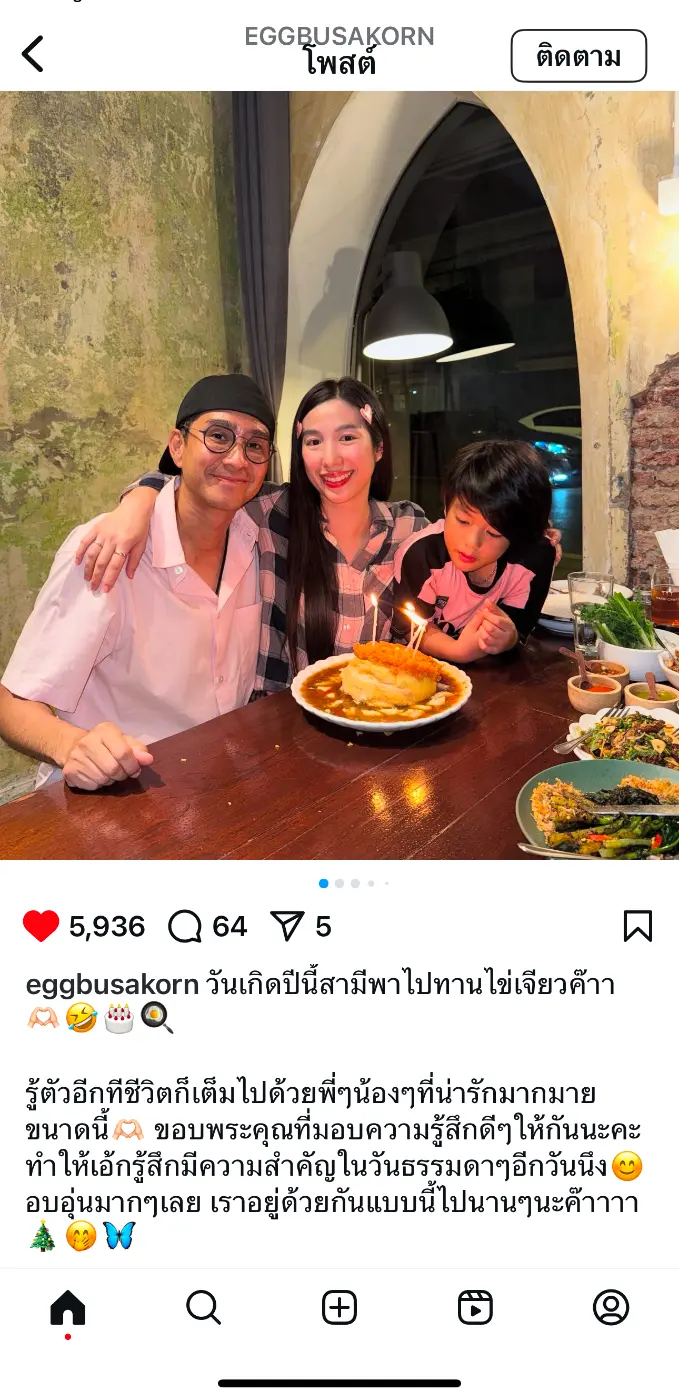วันเกิดปีนี้สามีพาไปทานไข่เจียวค๊าา🏻🤣🎂🍳 รู้ตัวอีกทีชีวิตก็เต็มไปด้วยพี่ ๆ น้อง ๆ ที่น่ารักมากมายขนาดนี้🏻 ขอบพระคุณที่มอบความรู้สึกดี ๆ ให้กันนะคะ ทำให้เอ้กรู้สึกมีความสำคัญในวันธรรมดา ๆ อีกวันนึง😊 อบอุ่นมาก ๆ เลย เราอยู่ด้วยกันแบบนี้ไปนาน ๆ นะค๊าาาา🎄🤭🦋 #HongmanopHome #เปิดบ้านหงษ์มานพ" ซึ่งก็มีแฟน ๆ เข้ามาคอมเมนต์ร่วมอวยพรวันคล้ายวันเกิดให้สาวเอ้กและชื่นชมในความน่ารักของครอบครัวนี้กันอย่างเนืองแน่น