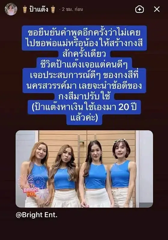 ทั้งนี้ก็เห็นว่าระบบกงสีมีประโยชน์ จึงนำมาปรับใช้กับช่องของป้าๆ ไม่เคยบอกน้องชายว่าให้ทำกงสี และก็ไม่เคยไปขอเงินใคร หลังจากที่ถูกโจมตีอย่างหนักว่า เกาะน้องแxก จึงรู้สึกเสียใจมาก เพราะที่ผ่านมาก็ทำงานหนักมาโดยตลอด แต่กลับโดนหลายคนว่า เกาะน้องแxก น้องหาเลี้ยงผัวมาตลอด รู้สึกสะเทือนใจเป็นอย่างมาก จึงอยากออกมาปกป้องศักดิ์ศรีของตัวเองบ้าง