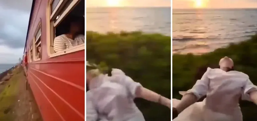 A Chinese tourist had a heart-stopping moment while traveling on Sri Lanka's coastal railway line. She fell from the train after being struck by a tree branch while trying to record a video.