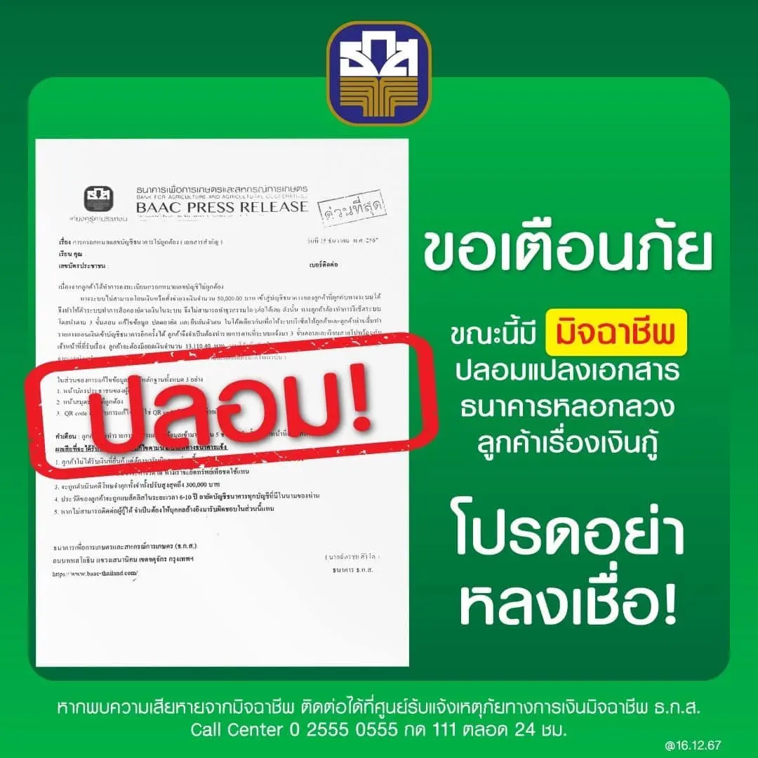 ธ.ก.ส. ขอเรียนว่า เอกสารดังกล่าวเป็นเอกสารปลอม ซึ่ง ธ.ก.ส. ไม่ใช่ผู้จัดทำ และไม่มีส่วนเกี่ยวข้องกับการกระทำดังกล่าว จึงขอให้เกษตรกรลูกค้า ประชาชนทั่วไป อย่าหลงเชื่อ และอย่าให้ข้อมูลหรือทำตามที่มิจฉาชีพแจ้งโดยเด็ดขาด😞