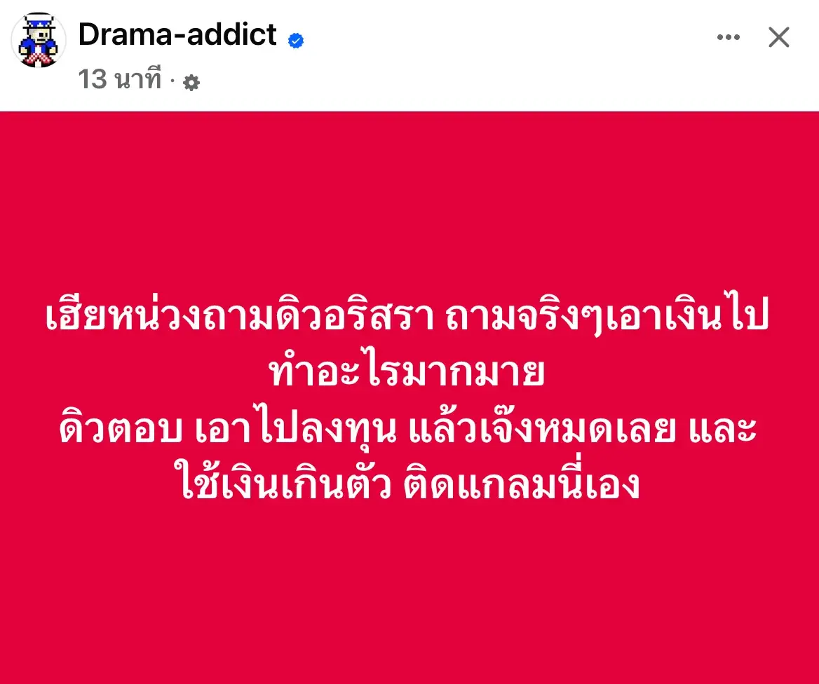 สำหรับวันนี้ไม่มีเรื่องราวอะไรน่าสนใจไปกว่า เรื่องของนักแสดงชื่อดังดิวอริสรา ที่ได้มีการหยิบยืม ทรัพย์สินมีมูลค่ากว่า 62 ล้านบาท จากทางไฮโซสาว เมนี่ นักธุรกิจพันล้าน จากนั้นทาง ดิว อริสราก็ไม่มี ทรัพย์สินดังกล่าวมาคืนเจ้าของได้