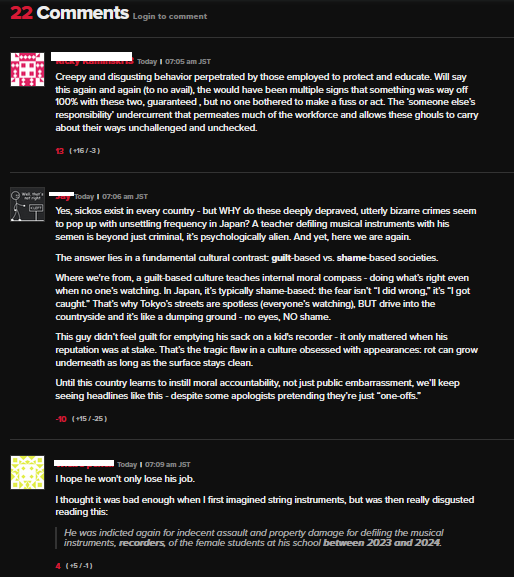 - คนโรคจิตมีอยู่ในทุกประเทศ แต่ทำไมอาชญากรรมที่เสื่อมทรามและแปลกประหลาดเหล่านี้ จึงดูเหมือนจะเกิดขึ้นบ่อยครั้งในญี่ปุ่น การที่ครูทำให้เครื่องดนตรีสกปรกด้วยน้ำอสุจิของเขา ถือเป็นการกระทำที่ผิดกฎหมาย แต่เป็นเรื่องแปลกทางจิตวิทยา...