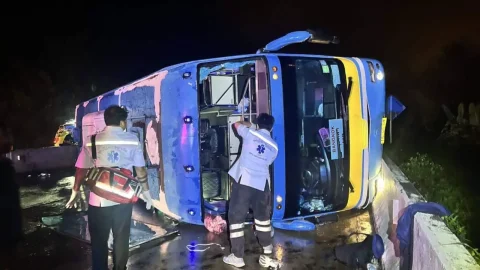 รถบัสท่องเที่ยวพลิกคว่ำที่จังหวัดลำปาง ทำให้ผู้โดยสารได้รับบาดเจ็บมากกว่า 39 ราย