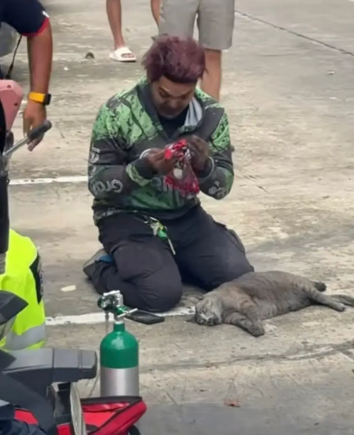 ในคลิปเราจะเห็นเขาวางแมวที่แน่นิ่งลงกับพื้น แล้วคุกเข่าลงกับพื้นคอนโดปั๊มหัวใจให้แมวทันที คือแม่งไม่ได้มีเวลาให้หายใจเลยนะ เขาทำด้วยสัญชาตญาณล้วน ๆ มือเปื้อนเขม่าดำ หน้าเต็มไปด้วยเหงื่อ แต่หัวใจเขาเปื้อนด้วย "ความหวัง" ล้วน ๆ