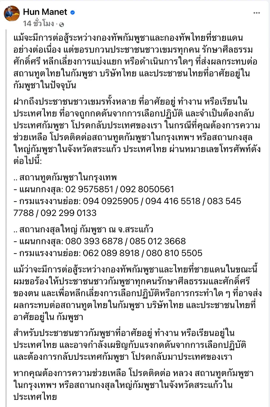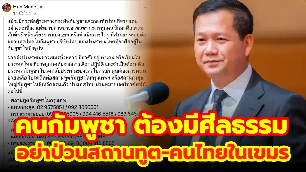 ฮุนมาเนต เตือนชาวเขมรต้องมีศีลธรรม แม้จะสู้รบกัน ก็อย่าป่วนสถานทูตไทย-คนไทยในเขมร