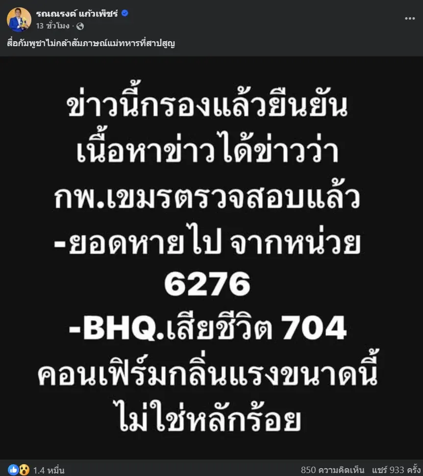 ทนายรณรงค์ โพสต์ กพ.เขมรตรวจสอบแล้ว ยอดทหาร หายไป จากหน่วย 6276 คน BHQ.เสียชีวิต 704