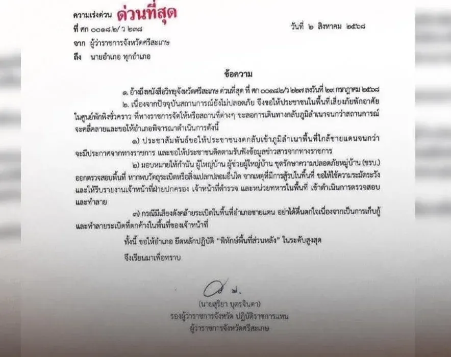 เมื่อวันที่ 2 สิงหาคม 2568 นายสุริยา บุตรจินดา รองผู้ว่าราชการจังหวัดศรีสะเกษ ปฏิบัติราชการแทนผู้ว่าราชการจังหวัด ได้ลงนามในหนังสือราชการ “ด่วนที่สุด” ส่งถึงนายอำเภอทุกอำเภอในจังหวัดศรีสะเกษ เพื่อขอความร่วมมือในการแจ้งเตือนประชาชนให้งดเว้นการเดินทางกลับบ้านหรือเข้าไปในพื้นที่แนวชายแดนไทย-กัมพูชาในช่วงนี้