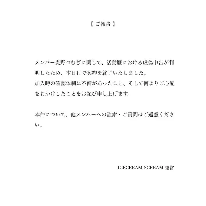 วันนี้ [ตามเวลาท้องถิ่น] นักร้องไอดอลสาว "มูกิโนะ สึมุงิ" จากวง วงเกิร์ลกรุ๊ปญี่ปุ่น "“Icecream Scream" ถูกไล่ออกหลังจากที่ชาวเน็ตหลายคน พบว่าเธอเคยเล่น AV มาก่อน จึงได้นำคลิป AV ดังกล่าวมาเผยแพร่บนเน็ต และ หลังจากนั้นชาวเน็ตก็ได้ทำการขุดคุ้ย แล้วพบว่าเธอเล่น AV ทั้งหมด 3 เรื่องด้วยกัน โดยเธอใช้ชื่อในวงการว่า "มิยูกิ" ซึ่งนั่นทำให้แฟนคลับและชาวเน็ต ร้องเรียนไปยังต้นสังกัดของเธอ ซึ่งเมื่อต้นสังกัดได้ดูคลิปเพื่อการยืนยัน พวกเขาก็ได้ออกประกาศว่า "ทางเราได้ยุติสัญญากับเธอ อย่างเป็นทางการ เป็นที่เรียบร้อยแล้ว"