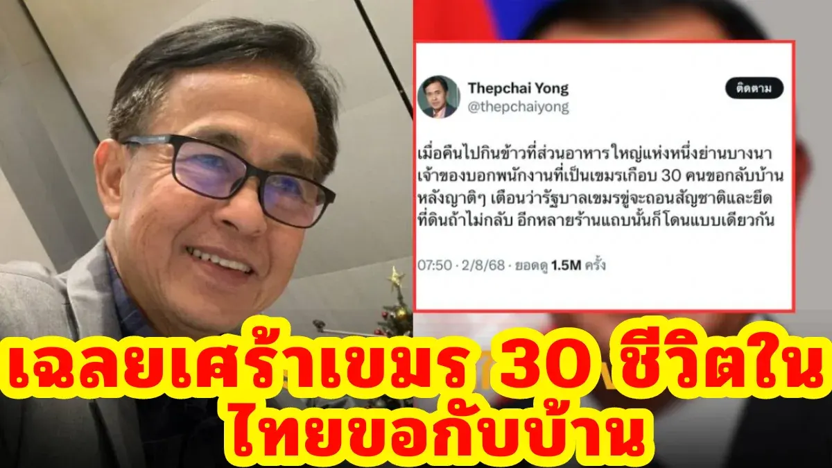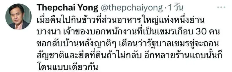 สถานการณ์แรงงานข้ามชาติในประเทศไทยกำลังอยู่ในภาวะตึงเครียดและน่าจับตามองอย่างใกล้ชิด หลังจากที่ "เทพชัย หย่อง" นักข่าวอาวุโสชื่อดัง ได้ออกมาโพสต์ผ่านโซเชียลมีเดียเมื่อค่ำคืนที่ผ่านมา โดยเปิดเผยประสบการณ์ตรง ขณะไปทานอาหารที่ศูนย์อาหารย่านบางนา และได้รับทราบจากเจ้าของร้านอาหารว่า พนักงานเชื้อสายกัมพูชาเกือบ 30 คนได้แจ้งขอลาออกแบบเร่งด่วน พร้อมเหตุผลที่ทำให้คนไทยจำนวนมากถึงกับ "อึ้ง"
