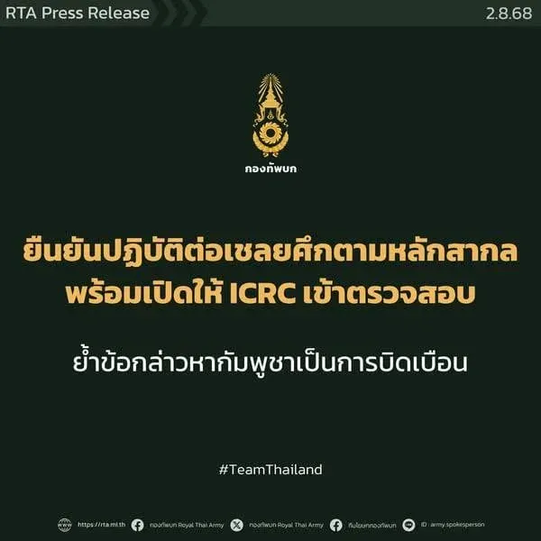 เช้าวันที่ 3 สิงหาคม 2568 ที่กรุงพนมเปญ พลโทหญิง มาลี โสเจียตา โฆษกกระทรวงกลาโหมกัมพูชา ได้จัดแถลงข่าวต่อหน้าสื่อมวลชนทั้งในประเทศและสื่อระหว่างประเทศ โดยกล่าวอย่างตรงไปตรงมาว่า: