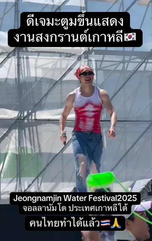 โดยวันนี้ (3 ส.ค. 68) ดีเจมะตูม ได้โพสต์คลิปวิดีโอขณะขึ้นทำการแสดงบนเวทีในงาน ระบุข้อความบนคลิปว่า “ดีเจมะตูมขึ้นแสดงงานสงกรานต์เกาหลี Jeongnamjin Water Festival 2025 จอลลานัมโด ประเทศเกาหลีใต้ คนไทยทำได้แล้ว” พร้อมแคปชัน “จากมหาสงกรานต์กรุงเทพ สู่งานเทศกาลน้ำจองนัมจิน , เกาหลีใต้ | ในนามศิลปินไทยตัวเล็ก ๆ คนนึง รู้สึกเป็นเกียรติมาก ๆ ครับ จากคนที่เต้น K-pop ขำ ๆ ลงโซเชียลมาตลอด ใครจะคิดว่าจะได้มาโชว์บนเวทีที่เกาหลีต่อหน้าคนดูร่วมแสนคน! ขอบคุณทุกกำลังใจครับ” ท่ามกลางแฟน ๆ และคนในวงการบันเทิงเข้ามาคอมเมนต์ชื่นชมกันอย่างล้นหลาม