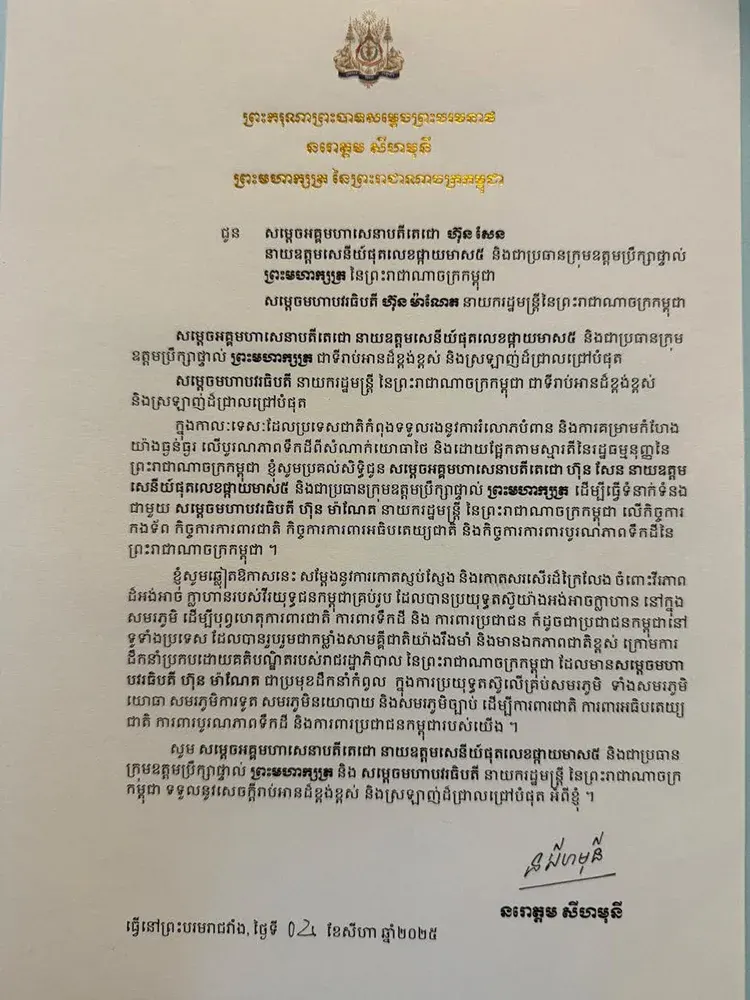 พระบาทสมเด็จพระบรมนาถ "นโรดม สีหมุนี" กษัตริย์ของกัมพูชา ได้โปรดเกล้าให้ประธานวุฒิสภา และ อดีตนายกรัฐมนตรี "ฮุน เซน" รับหน้าที่ประสานงาน ด้านการป้องกันประเทศ เพื่อรับมือกับความตึงเครียด ที่กำลังทวีความรุนแรงขึ้นตามแนวชายแดนกัมพูชา-ไทย เป็นเอกสารทางราชการที่ระบุว่า...