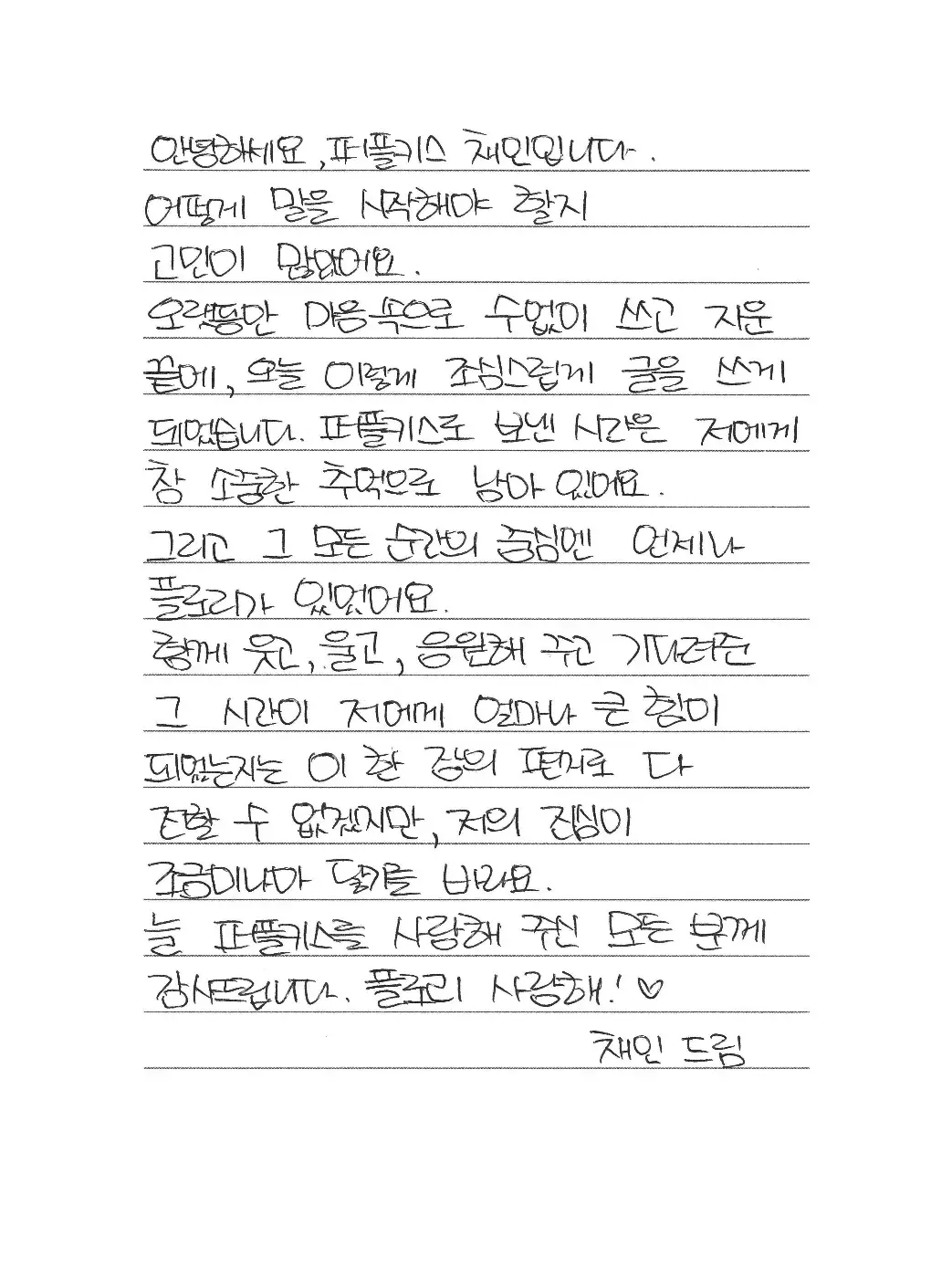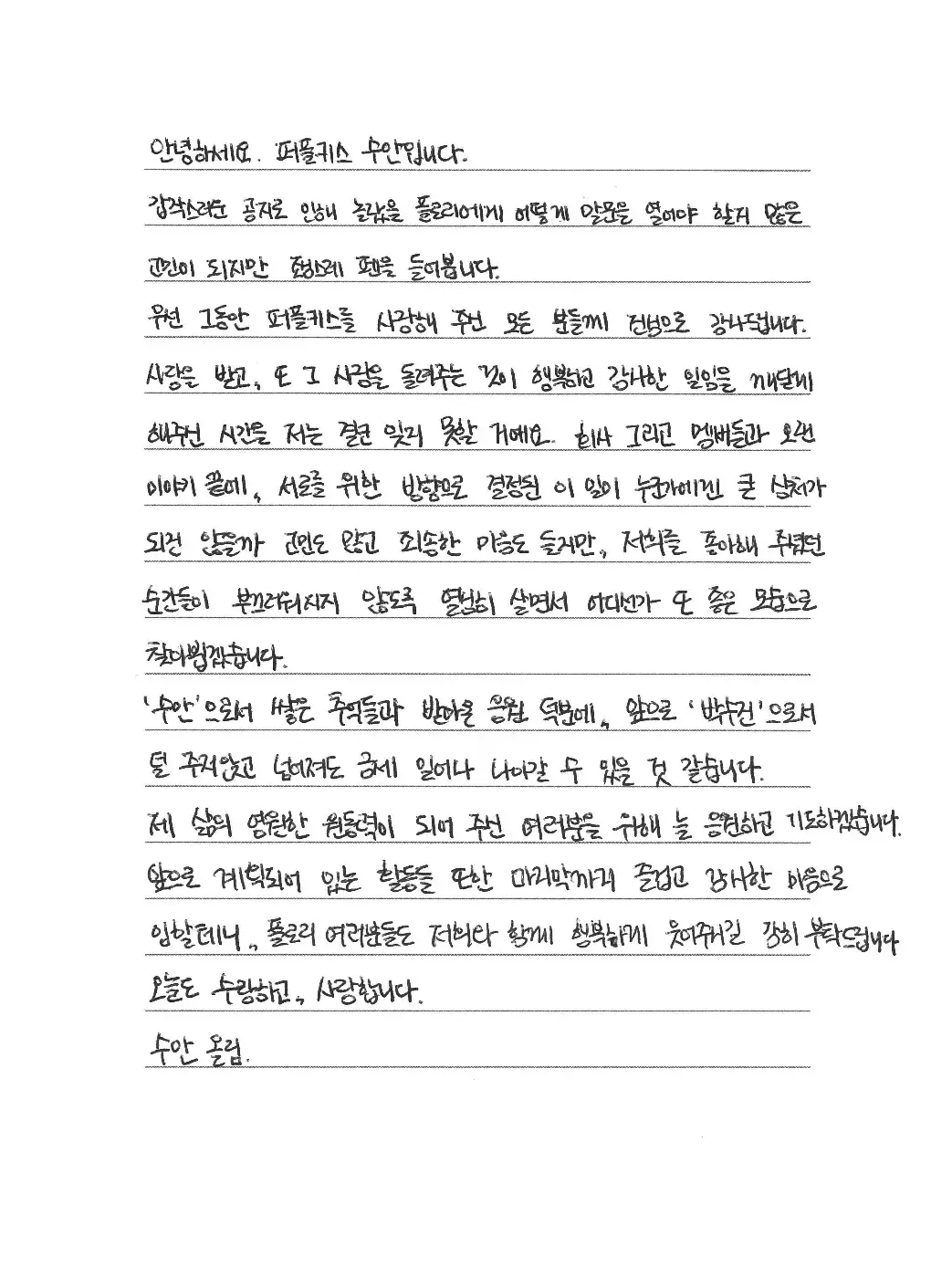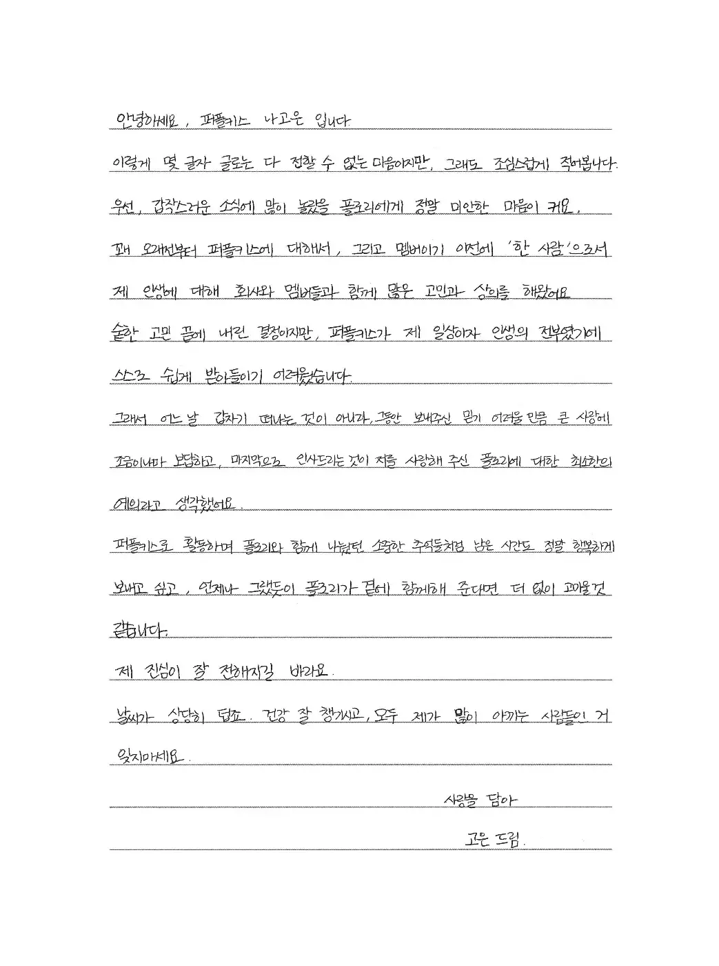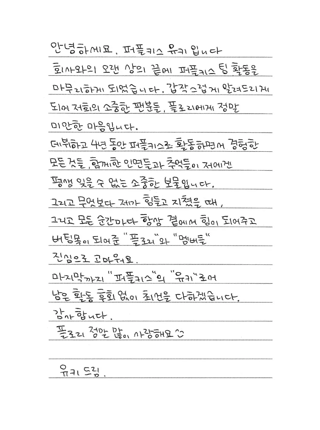 วงเกิร์ลกรุ๊ปเกาหลีใต้ "เพอร์เพิลคิส" ได้สร้างความตกตะลึงอย่างไม่คาดคิด เมื่อต้นสังกัดอย่าง RBW ได้ประกาศยุติกิจกรรมของวง "เพอร์เพิลคิส" อย่างเป็นทางการ ซึ่งได้สร้างความตกตะลึงให้กับแฟนๆเป็นอย่างมาก ซึ่งสมาชิกวง "เพอร์เพิลคิส" ได้ส่งจดหมายอำลา ที่เขียนด้วยลายมือถึงแฟนๆ โดยข้อความของพวกเธอเต็มไปด้วย ความโศกเศร้าและความขอบคุณ...