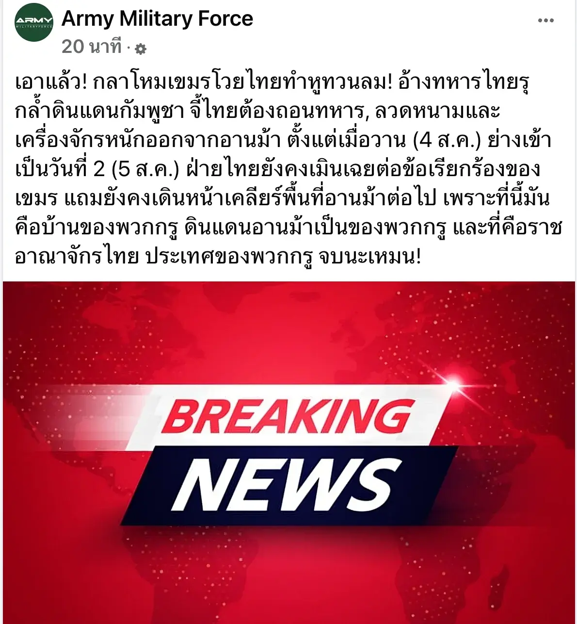 ล่าสุดเพจดัง Army Military Force ออกมาโพสต์ขอความระบุว่า ด่วน! กลาโหมกัมพูชาประท้วงไทย อ้างทหารไทยรุกล้ำพื้นที่อานม้า วางลวดหนาม จี้ไทยต้องรื้อถอนลวดหนามและถอนเครื่องจักรของออก แต่พบว่าไทยเมินเฉยต่อข้อเรียกร้องจากฝ่ายกัมพูชา