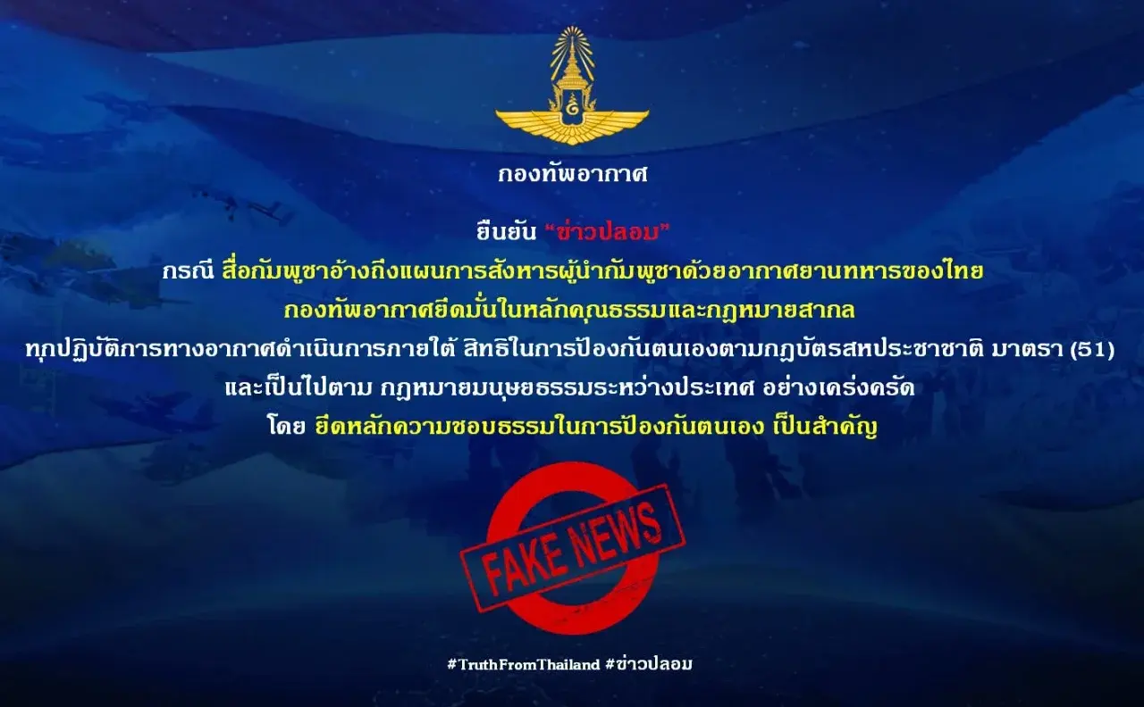 กองทัพอากาศ ยืนยัน “ข่าวปลอม” กรณี สื่อกัมพูชาอ้างถึงแผนการสังหารผู้นำกัมพูชาด้วยอากาศยานทหารของไทย