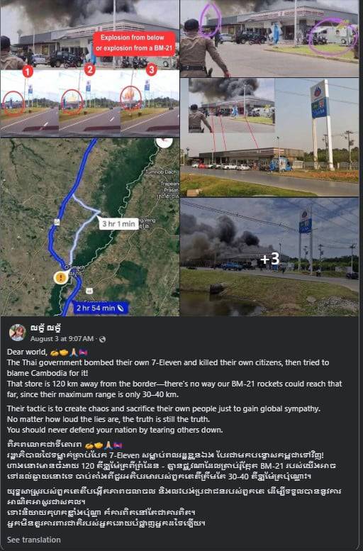 โพสต์ดังกล่าวของชาวเน็ตกัมพูชาได้แสดงความ "มั่นใจอย่างเต็มเปี่ยม" ว่า เหตุระเบิดที่เกิดขึ้นบริเวณร้านสะดวกซื้อในฝั่งไทย ไม่อาจเกิดจากจรวด BM-21 ของกัมพูชาได้ เพราะจรวดรุ่นนี้มีพิสัยยิงไม่เกิน 30-40 กิโลเมตร