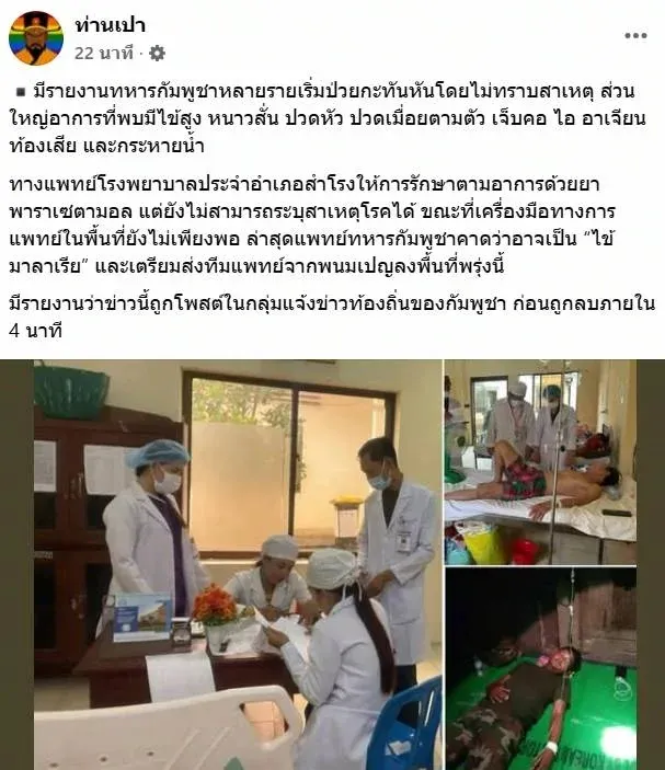 ลือสะพัด! ทหารกัมพูชาป่วยวิกฤตกะทันหัน ก่อนสื่อเขมรลบโพสต์หนี