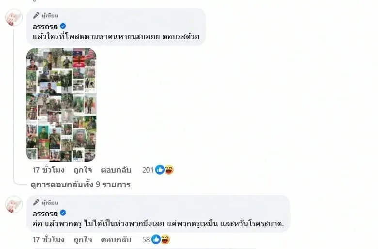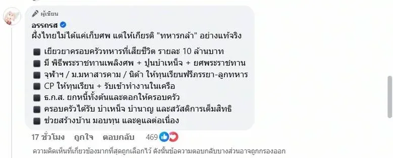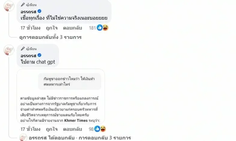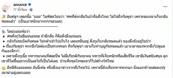 ขณะที่ความโศกเศร้ายังปกคลุมครอบครัวของทหารที่หายไป ล่าสุด เพจเฟซบุ๊ก “อรรถรส” ได้เผยแพร่คลิปวิดีโอจาก อินฟลูเอนเซอร์ชาวกัมพูชา รายหนึ่งที่ใช้ชื่อว่า “บอย” ซึ่งได้ออกมาไลฟ์สดตอบโต้ข่าวที่ว่า “ศพในป่าคือทหารกัมพูชา” โดยเจ้าตัวกล่าวหาว่า