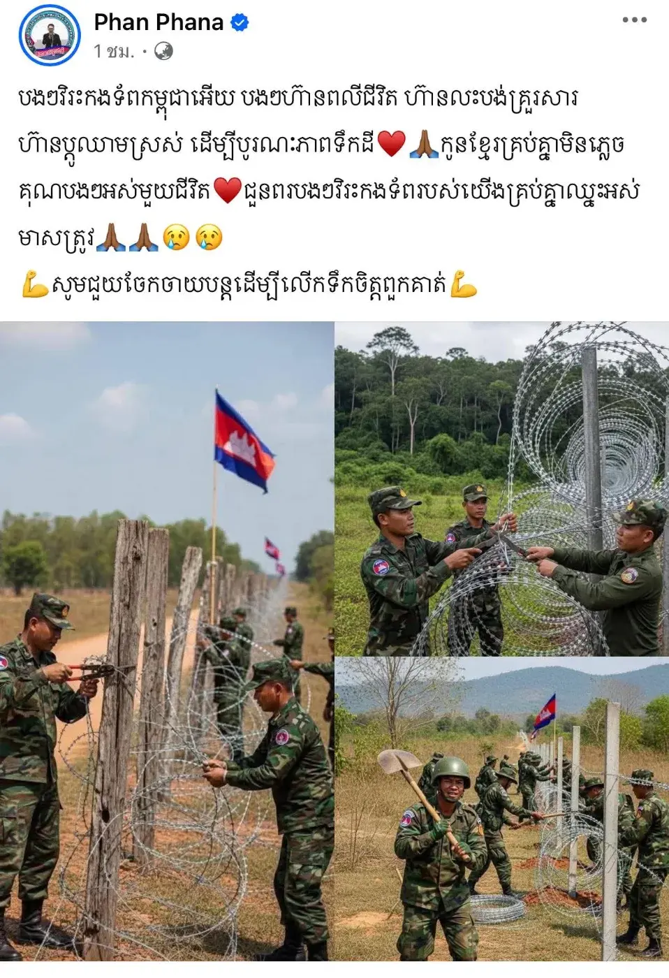 โดยระบุว่าขณะนี้กองกำลังกัมพูชากำลังทำการลาดตระเวนตามแนวชายแดน เพื่อปกป้องประเทศชาติและประชาชนชาวกัมพูชา โดยภาพ AI ดังกล่าวเป็นภาพของทหารกัมพูชาล้อมลวดหนาม ซึ่งอยู่ตรงส่วนไหนของกัมพูชาก็ไม่มีใครรู้ เพราะภาพดังกล่าวเป็นภาพ AI
