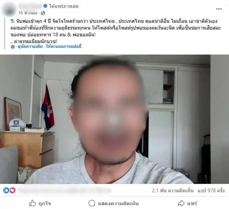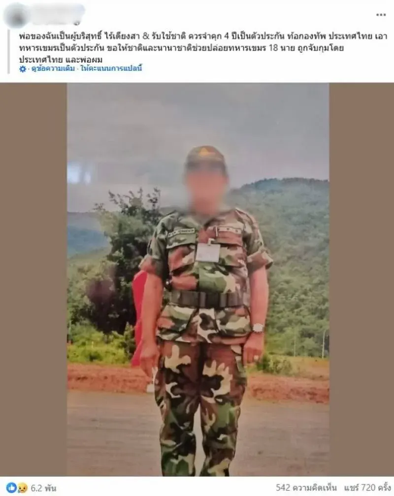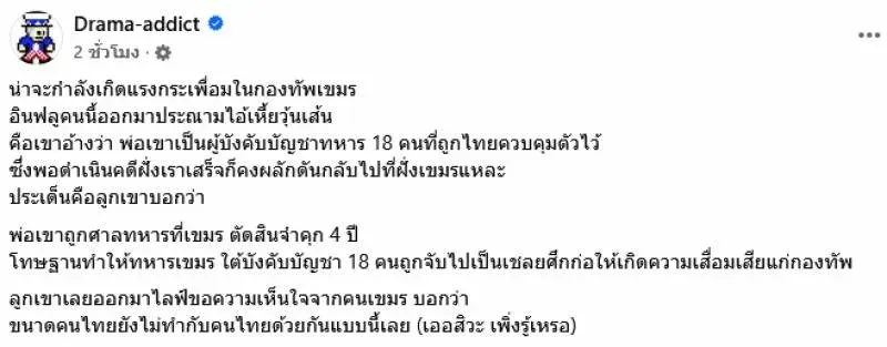 เมื่อวันที่ 7 สิงหาคม 2568 เพจชื่อดัง Drama Addict ได้เผยแพร่คลิปวิดีโอที่กำลังถูกพูดถึงอย่างกว้างขวางในสังคมออนไลน์ โดยคลิปดังกล่าวเป็นการไลฟ์สดของชายชาวกัมพูชารายหนึ่ง ซึ่งออกมาเปิดใจเล่าความรู้สึกอย่างตรงไปตรงมาและเต็มไปด้วยความเจ็บปวด หลังจากทราบข่าวว่าบิดาของเขา ซึ่งเป็นหนึ่งในทหารกัมพูชา 18 นายที่ถูกกองทัพไทยควบคุมตัวระหว่างเหตุปะทะชายแดน ได้ถูก ศาลทหารกัมพูชาตัดสินจำคุก 4 ปี แม้ในขณะนั้นบิดาของเขายังอยู่ภายใต้การควบคุมของฝ่ายไทย