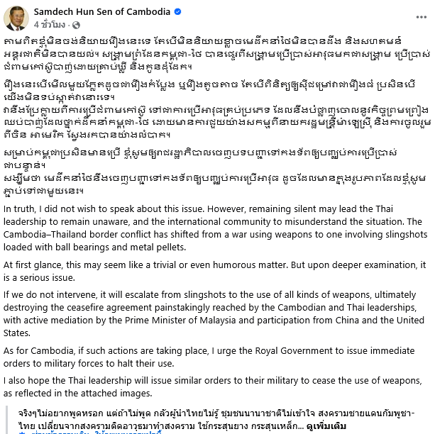 วันนี้เพจเฟสบุ๊ก "Samdech Hun Sen of Cambodia" ซึ่งเป็นเพจเฟสหลักของ "ฮุน เซน" ได้โพสต์ว่า "จริงๆไม่อยากพูดหรอก แต่ถ้าไม่พูด กลัวผู้นําไทยไม่รู้ ชุมชนนานาชาติไม่เข้าใจ สงครามชายแดนกัมพูชา-ไทย ตอนนี้เปลี่ยนจากสงครามติดอาวุธ มาทําสงครามโดยใช้กระสุนยาง กระสุนเหล็กแทน"