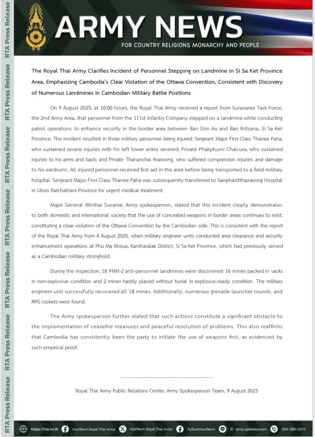 โฆษกกองทัพบก พลตรี "วินธัย สุวารี" กล่าวว่า "เหตุการณ์ดังกล่าวอาจทำให้สังคม ทั้งในประเทศและต่างประเทศเห็นได้ชัดว่า การใช้อาวุธต่อกันในพื้นที่ชายแดน ยังคงมีอยู่ในลักษณะการซ่อนรูป" และ "ถือเป็นการกระทำที่ฝ่าฝืน อนุสัญญาออตตาวา ของฝ่ายกัมพูชาอย่างชัดเจน ซึ่งสอดคล้องกับการที่กองทัพบกได้รับรายงานเมื่อวันที่ 4 สิงหาคม 2568 ที่หน่วยทหารช่างได้ดำเนินการเคลียร์พื้นที่และเสริมความมั่นคงบริเวณภูมะเขือ อำเภอกันทรลักษ์ จังหวัดศรีสะเกษ ซึ่งเคยเป็นที่มั่นของฝ่ายทหารกัมพูชา" และ "จากการตรวจสอบพบ ทุ่นระเบิดสังหารบุคคลชนิด PMN-2 จำนวน 18 ทุ่น โดย 16 ทุ่น บรรจุในกระสอบ ยังไม่อยู่ในสภาพพร้อมระเบิด และ 2 ทุ่น วางแบบเร่งด่วนโดยไม่ฝังกลบ อยู่ในสภาพพร้อมระเบิด หน่วยทหารช่างได้เก็บกู้ครบทั้ง 18 ทุ่นแล้ว นอกจากนี้ยังตรวจพบลูกกระสุนเครื่องยิงลูกระเบิดและลูกจรวด RPG จำนวนมาก"