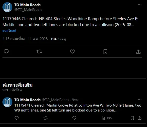 ทวิตเตอร์ของ "TO Main Roads" ได้โพสต์ว่า "เกิดการจราจรติดขัดอย่างหนัก ในเลนกลางและเลนซ้าย ทั้ง 2 เลน เนื่องจากเกิดอุบัติเหตุที่ถนนวูดไบน์ ก่อนถึงถนนสตีลส์"