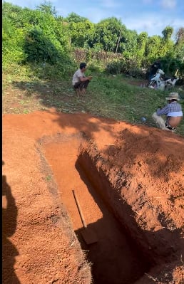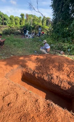 ลูกของทหารเขมรแนวหน้าชายแดนไทย-กัมพูชา ขุดหลุมฝั่งร่างของทหารที่เสียชีวิตจากอาการป่วย ข้างหลุมศพแม่