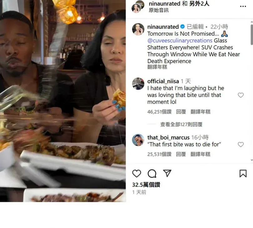 อินฟลูเอนเซอร์สายอาหาร ที่มีชื่อว่า "นีน่า ซานติอะโก" ซึ่งมีผู้ติดตามกว่า 220,000 คน ได้อัพคลิปขณะเกิดเหตุการณ์ดังกล่าว บน IG ส่วนตัวของเธอ ซึ่งในคลิปแสดงให้เห็นว่าเธอกับเพื่อนร่วมงานชื่อ "แพทริก แบลควู๊ด" กำลังนั่งกินอาหาร และ ถ่ายทำอย่างสนุกสนาน ในระหว่างที่ยกแก้วดื่มฉลองและกัดเบอร์เกอร์ปลาแซลมอนอยู่นั้น รถ SUV ก็พุ่งชนกระจกหน้าร้านเข้ามาอย่างกะทันหัน แรงกระแทกทำให้เศษกระจกแตกกระจาย อาหารบนโต๊ะกระเด็นกระจายไปทั่วร้าน พนักงานที่อยู่ในเหตุการณ์ ถึงกับอ้าปากค้างด้วยความตกใจ ส่วน "แพทริก แบลควู๊ด" ได้รีบผลัก "นีน่า ซานติอะโก" ออกจากแนวรถได้ทันเวลา ทำให้เธอรอดพ้นการบาดเจ็บร้ายแรง ซึ่งทั้ง 2 คน ถูกนำส่งโรงพยาบาลในเวลาต่อมา โดยมีบาดแผลจากเศษกระจกที่ใบหน้า มือ และขา แต่โดยรวมอาการปลอดภัยดี...