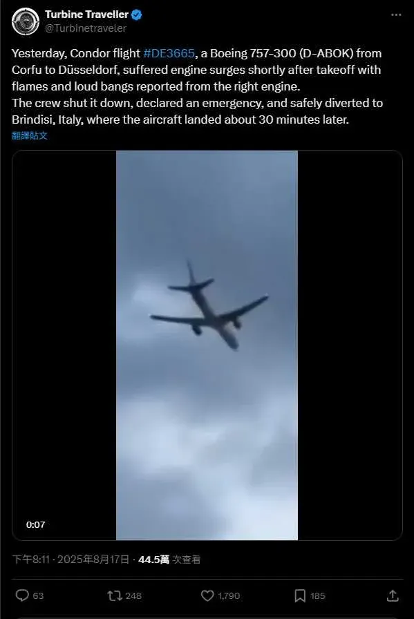 วันนี้ [ตามเวลาท้องถิ่น] สายการบิน "คอนดอร์ แอร์เวย์" ของเยอรมนี ซึ่งเที่ยวบินหนึ่งที่ออกเดินทางจากเกาะคอร์ฟู ประเทศกรีซ มุ่งหน้าสู่เมืองดุสเซลดอร์ฟ ประเทศเยอรมนี ได้เกิดเหตุเครื่องยนต์ด้านขวาลุกไหม้ หลังจากทะยานขึ้นได้เพียงไม่นาน ซึ่งเครื่องบินลำดังกล่าว มีผู้โดยสารและลูกเรือรวม 273 ชีวิตอยู่บนเครื่อง ซึ่งพวกเขาต่างเผชิญเหตุการณ์ระทึกกลางอากาศ แต่สุดท้ายสามารถนำเครื่องลงจอดฉุกเฉิน ที่สนามบินเมืองบรินดิซี ประเทศอิตาลี ได้อย่างปลอดภัย โดยไม่มีผู้ใดได้รับบาดเจ็บ หรือ เสียชีวิต...