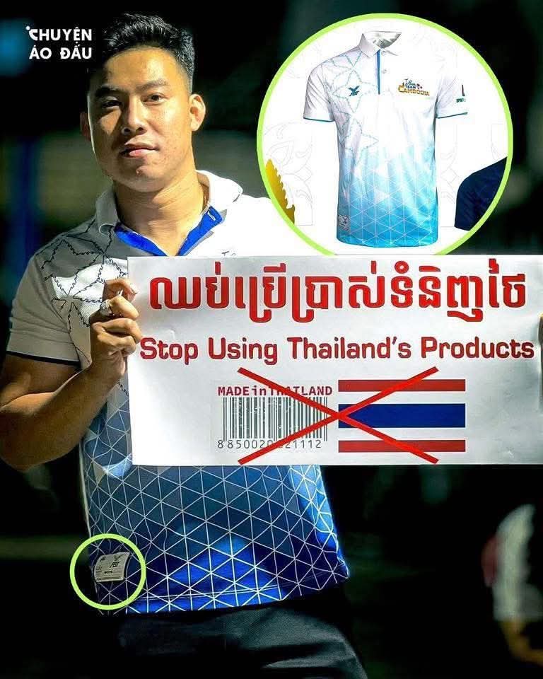 กลายเป็นเรื่องขำขันที่ถูกแชร์ไปทั่วโลกออนไลน์ เมื่อมีภาพนักกีฬาชาวกัมพูชาถือป้ายรณรงค์ “แบนสินค้าไทย” ด้วยท่าทีจริงจัง แต่สิ่งที่ทำให้คนไทยรวมถึงชาวเน็ตต่างประเทศถึงกับหลุดหัวเราะ คือ เจ้าตัวกลับสวมใส่เสื้อกีฬายี่ห้อ FBT ซึ่งเป็นแบรนด์สัญชาติไทยแท้ ๆ
