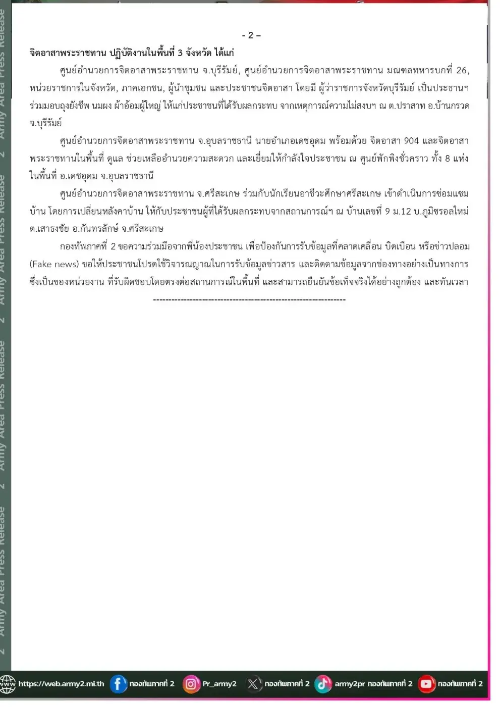 กองทัพภาคที่ 2 ขอความร่วมมือจากพี่น้องประชาชน เพื่อป้องกันการรับข้อมูลที่คลาดเคลื่อน บิดเบือน หรือข่าวปลอม (Fake news) ขอให้ประชาชนโปรดใช้วิจารณญาณในการรับข้อมูลข่าวสาร และติดตามข้อมูลจากช่องทางอย่างเป็นทางการ ซึ่งเป็นของหน่วยงาน ที่รับผิดชอบโดยตรงต่อสถานการณ์ในพื้นที่ และสามารถยืนยันข้อเท็จจริงได้อย่างถูกต้อง และทันเวลา