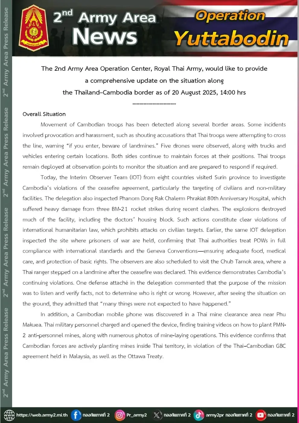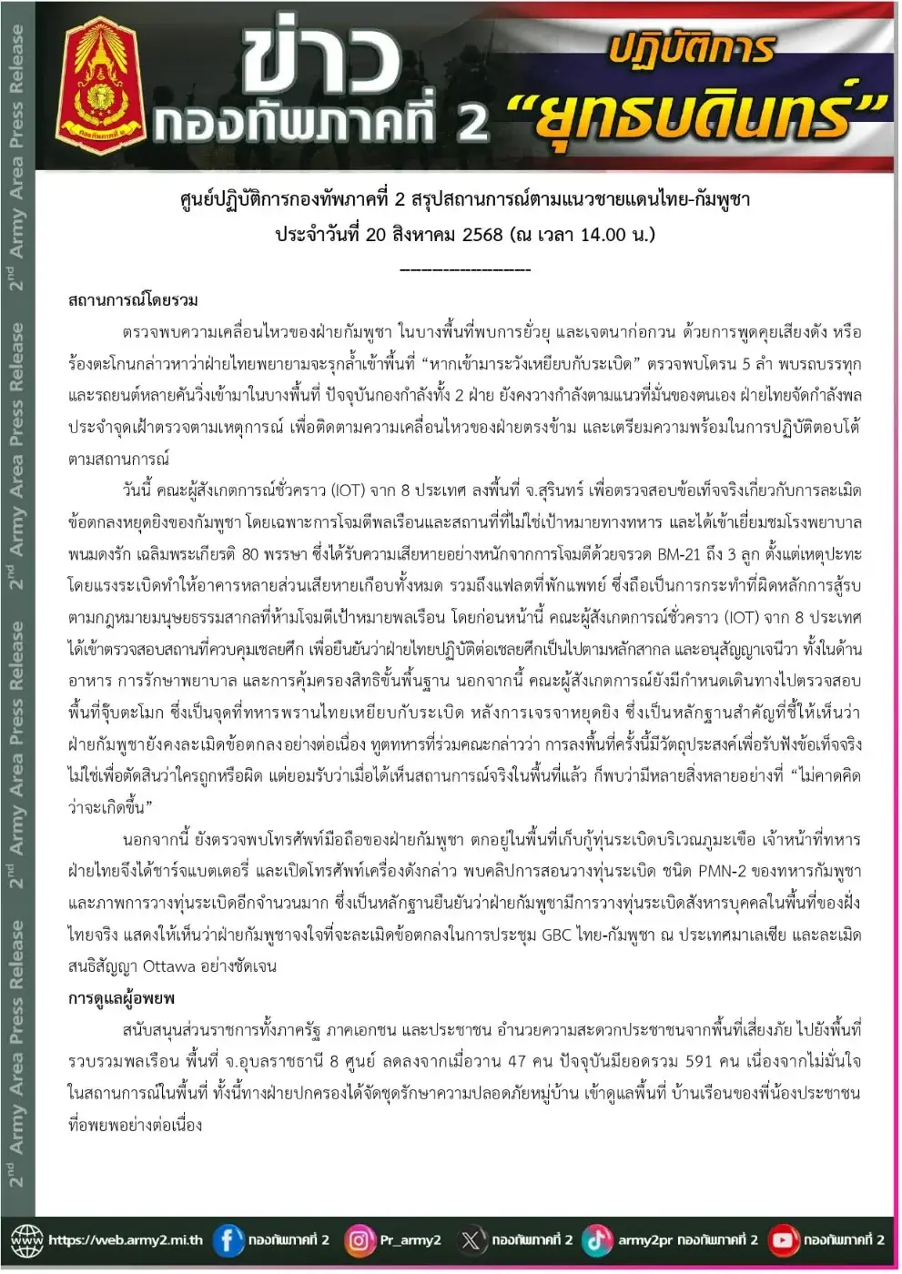 ศูนย์ปฏิบัติการกองทัพภาคที่ 2 สรุปสถานการณ์ตามแนวชายแดนไทย-กัมพูชา ประจำวันที่ 20 สิงหาคม 2568 (ณ เวลา 14.00 น.)
