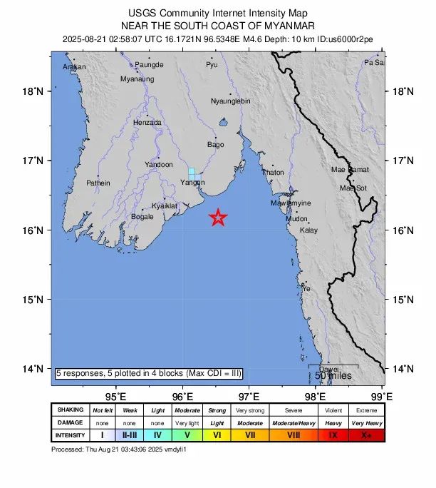 แต่สำนักงานสำรวจธรณีวิทยา ของอเมริกากล่าวว่า "เกิดเหตุแผ่นดินไหวขนาด 4.6 ทางตอนใต้ของเมียนมา โดยมีศูนย์กลางอยู่ที่ระดับความลึก 10 กิโลเมตร และมีพิกัดอยู่ที่ 16.172 ละติจูดองศาเหนือ และ 96.535 ลองจิจูดองศาตะวันออก"