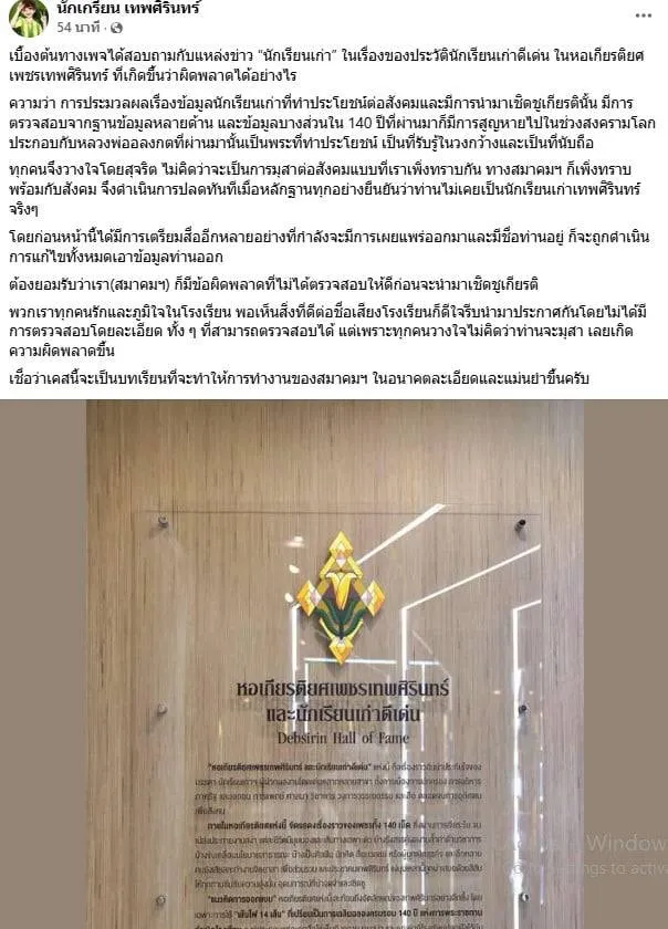 “เราเพิ่งทราบพร้อมกับสังคม และเมื่อหลักฐานยืนยันว่าท่านไม่เคยเป็นนักเรียนเก่าเทพศิรินทร์จริง ๆ เราจึงดำเนินการปลดทันที” แหล่งข่าวสมาคมนักเรียนเก่าเทพศิรินทร์กล่าว