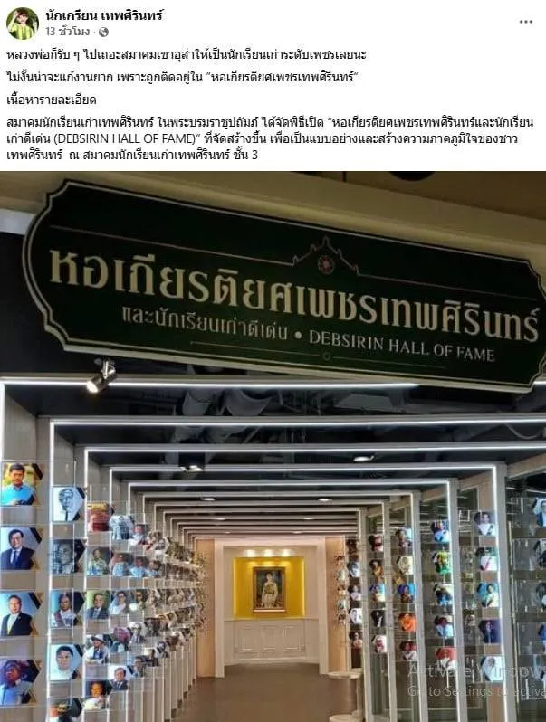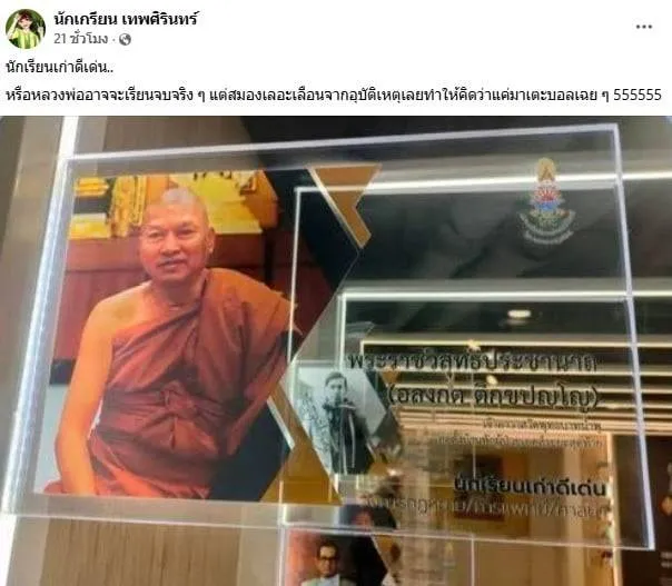 ล่าสุดเพจเฟซบุ๊ก นักเกรียน เทพศิรินทร์ ได้แชร์ภาพหอเกียรติยศเพชรเทพศิรินทร์ พร้อมภาพของนักเรียนเก่าดีเด่น และมีภาพหลวงพ่ออลงกตอยู่ด้วย โดยระบุข้อความว่า “นักเรียนเก่าดีเด่น…หรือหลวงพ่ออาจจะเรียนจบจริง ๆ แต่สมองเลอะเลือนจากอุบัติเหตุ เลยทำให้คิดว่าแค่มาเตะบอลเฉย ๆ”