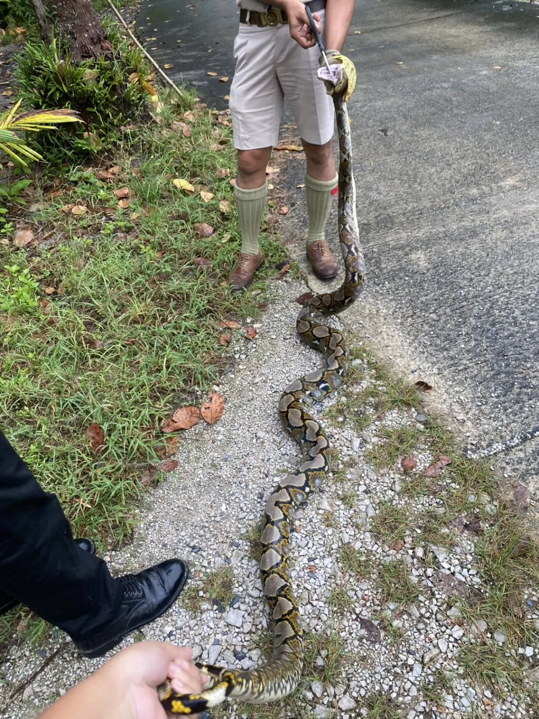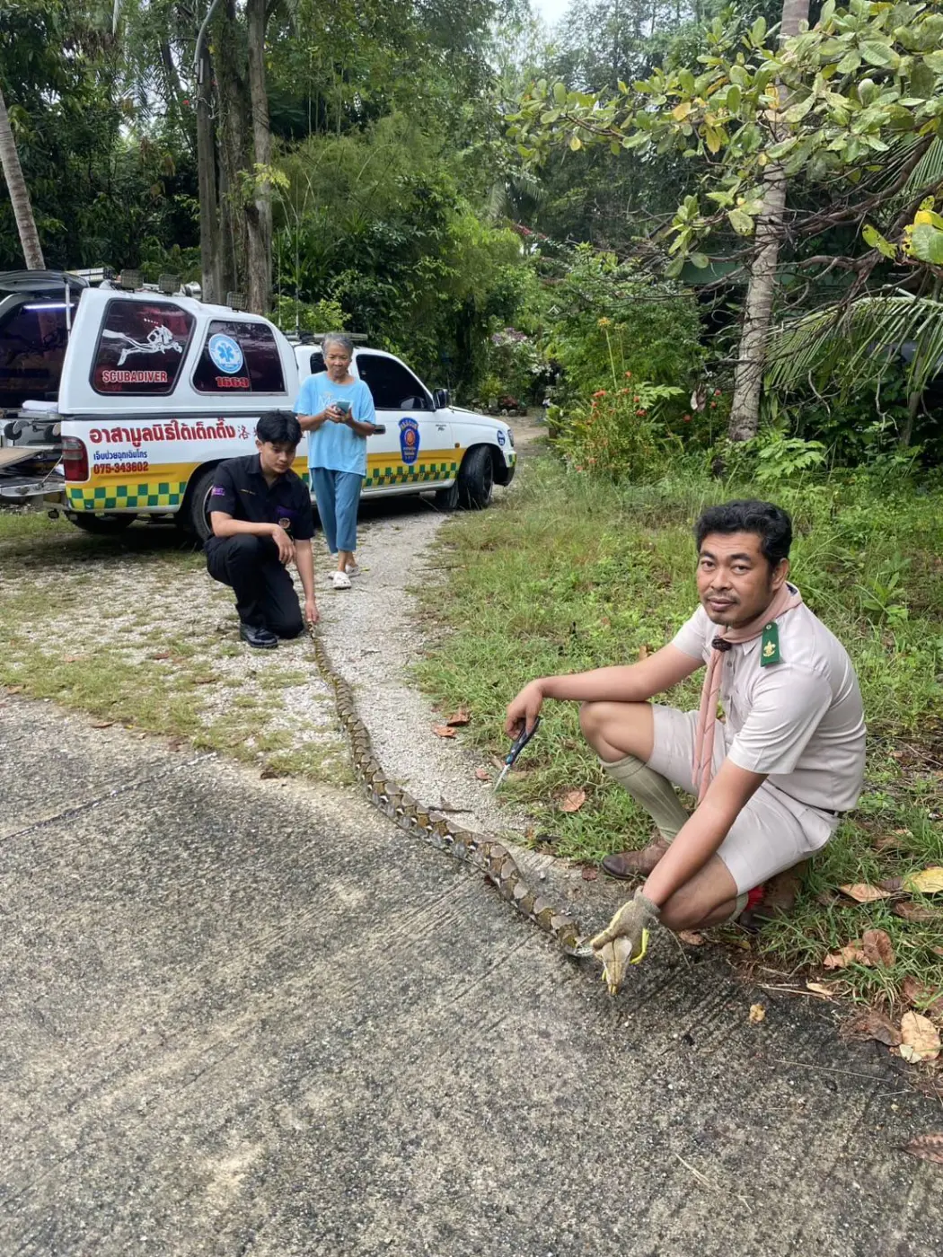 เมื่อถึงที่เกิดเหตุพบนางศิริลักษณ์ อายุ 70 ปี เจ้าของบ้าน และคนในครอบครัว ยืนรอเจ้าหน้าที่หน้าก่อน ก่อนจะรีบพาไปเล้าไก่หลังบ้าน จุดที่พบงูเหลือม พบงุเหลือมยาวประมาณ 4 เมตร สภาพถูกอวนเล้าไก่พันลำตัวจนแน่น เจ้าหน้าที่จึงช่วยเหลือโดยใช้บ่วงคล้องจับหัวงูเหลือมเอาไว้ ป้องกันงูเหลือมแว้กัด ก่อนจะใช้มีดคัดเตอร์ตัดอวนออก โดยใช้เวลาประมาณ 10 นาที จึงช่วยงูเหลือสำเร็จ พบว่าลำตัวงูเหลือมมีร่อยรอยถูกอวนบาดเลือดไหลซิบ ก่อนจะนำงูเหลือมออกมาหน้าบ้านใส่กระสอบไปปล่อยป่า