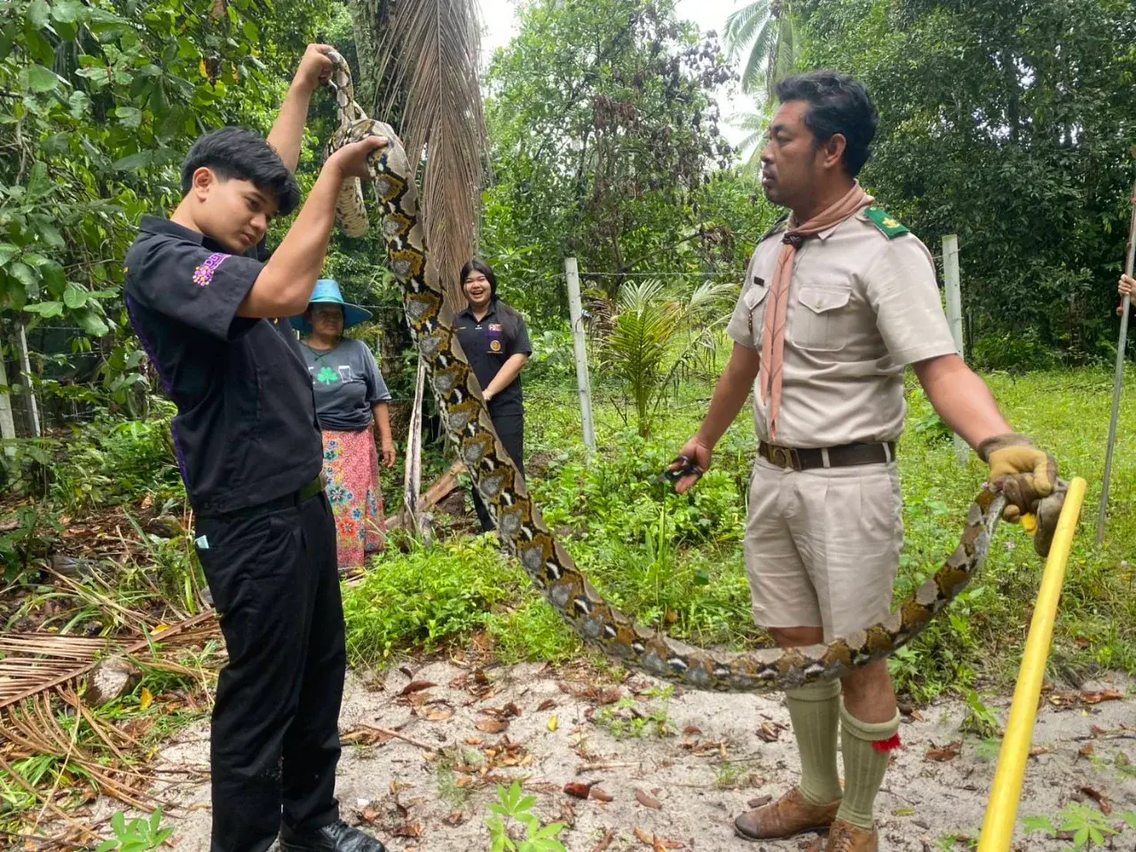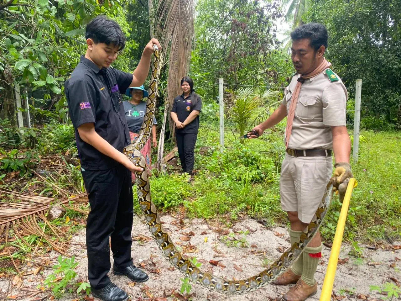 สอบถามเจ้าของบ้าน เล่าว่า ตนเลี้ยงไก่หลังบ้านมานานแล้ว ก่อนหน้านี้ไก่หายบ่อย จึงนำอวนม้าอมเล้าไก่ไว้ ที่ผ่านมามีงูเหลือมติดอวนล้อมเล้าไก่ 4 ตัวแล้ว ตัวนี้เป็นตัวที่ 5