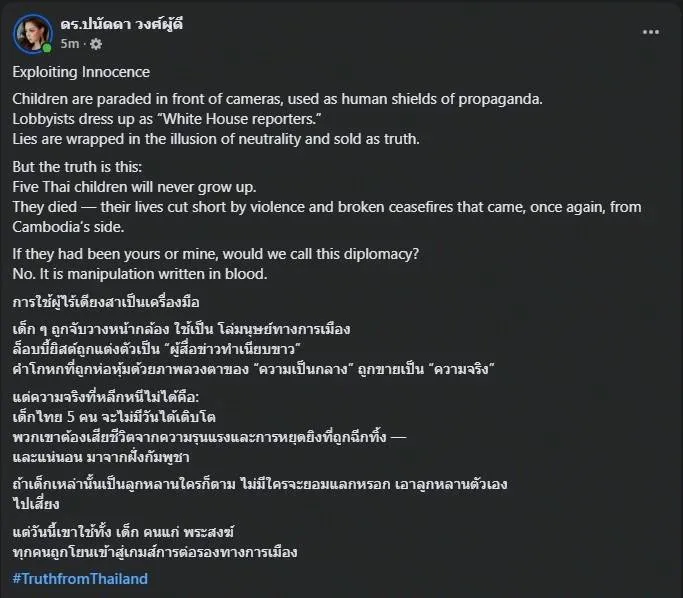"คำโกหกที่ถูกห่อหุ้มด้วยภาพลวงตาของความเป็นกลาง ถูกชายเป็นความจริง แต่ความจริงที่หลีกหนีไม่ได้คือ เด็กไทย 5 คน จะไม่มีวันได้เติบโต พวกเขาต้องเสียชีวิตจากความรุนแรงและการหยุดยิงที่ถูกฉีกทิ้ง – และแน่นอน มาจากฝั่งกัมพูชา"