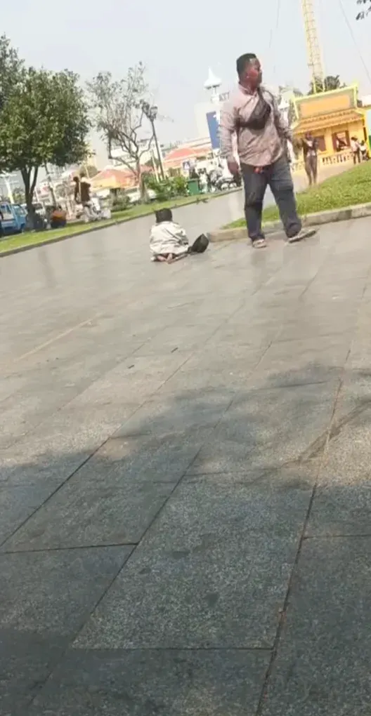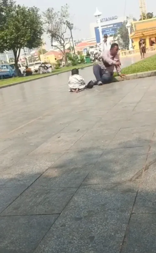 ชายชาวกัมพูชา ซึ่งมีฐานะเป็นพ่อพาลูกชายวัย 4 ขวบมานั่งขอทานที่บริเวณ ในกรุงพนมเปญ