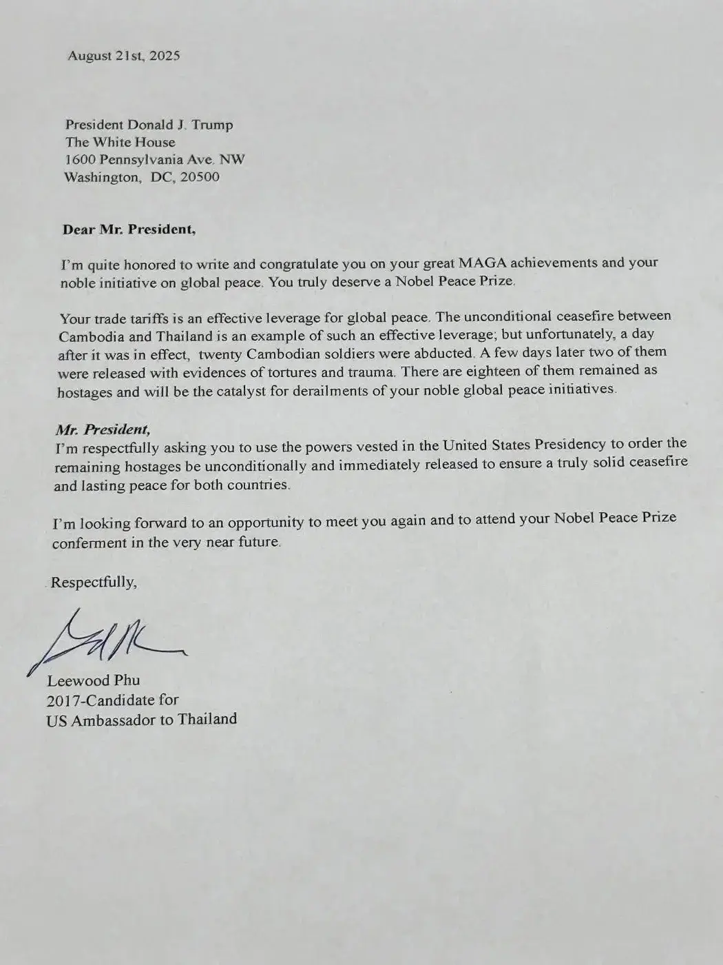 วันนี้เขมรปั่นข่าวทำร้ายประเทศไทยของเราอีกครั้ง โซเชี่ยลเขมรพร้อมใจกันแพร่กระจายข่าวของนายลีวูด ภู (Leewood Phu) ชาวเขมร ส่งจดหมายเปิดผนึกถึงทรัมป์ ประธานาธิบดีสหรัฐอเมริกา เพื่อเรียกร้องให้ทรัมป์อำนาจที่มีอยู่สั่งให้ทางการไทยปล่อยตัวทหาร 18 ราย ที่ถูกจับกุมอยู่ในขณะนี้
