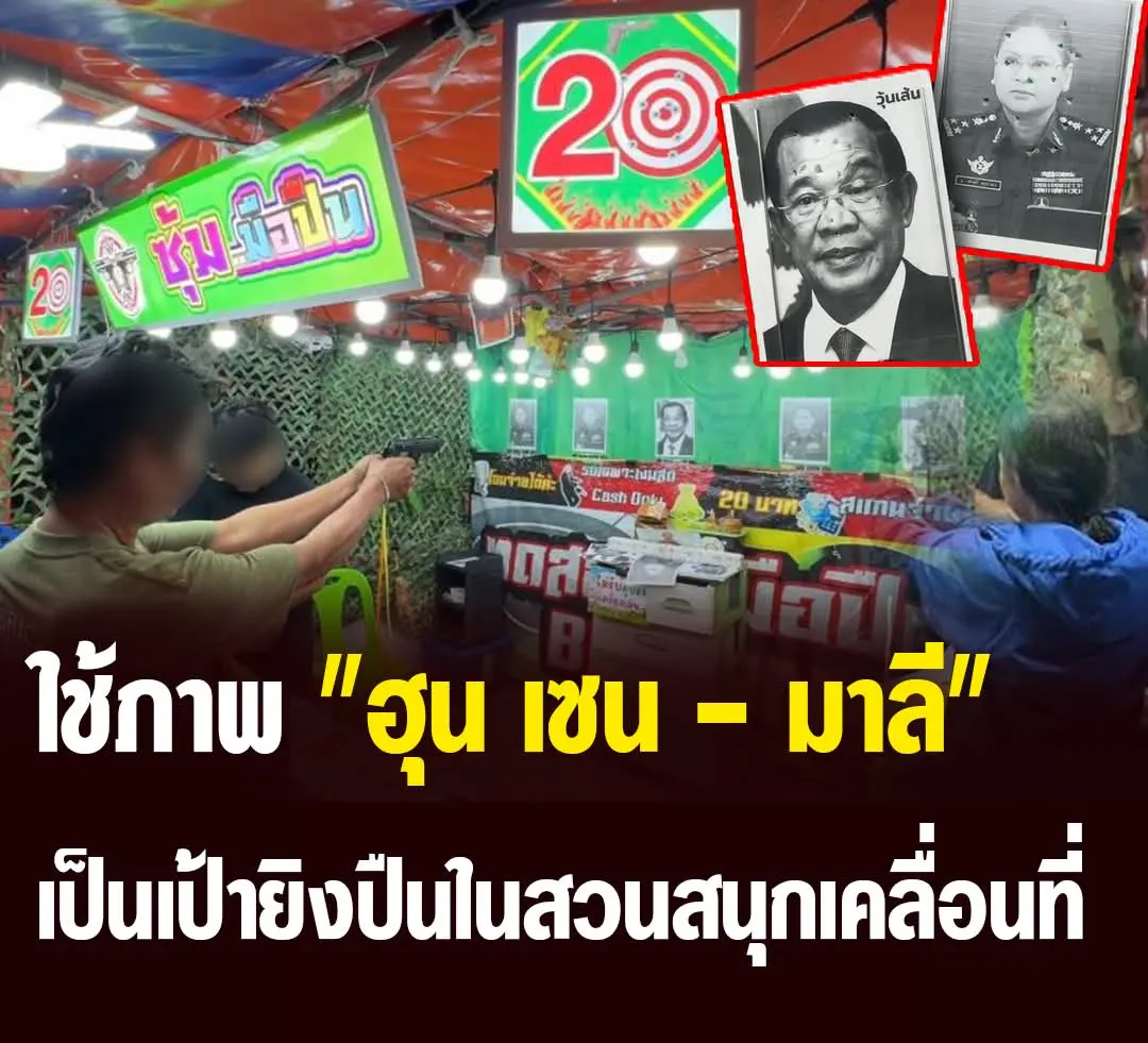 ฮือฮา สวนสนุกเคลื่อนที่ในเพชรบุรี เปิดซุ้มยิงปืนสุดแปลกใช้ภาพ “สมเด็จฮุน เซน” อดีตนายกฯ กัมพูชา และ “มาลี โสเจียตา” โฆษกกลาโหมกัมพูชา เป็นเป้าให้ประชาชนร่วมสนุก