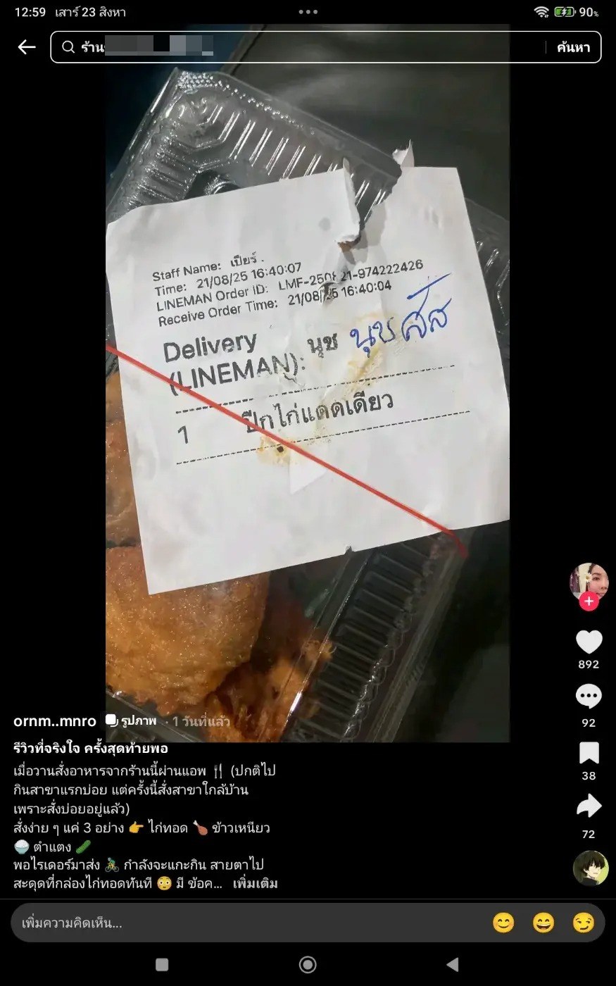โดยเจ้าของโพสท์กล่าวว่า "ครั้งสุดท้ายพอ เมื่อวานสั่งอาหารจากร้านนี้ผ่านแอพ ปกติไปกินบ่อย แต่ครั้งนี้สั่งสาขาใกล้บ้าน เพราะสั่งบ่อยอยู่แล้ว สั่งง่ายๆ แค่ 3 อย่าง ไก่ทอด ข้าวเหนียว ตำแตง