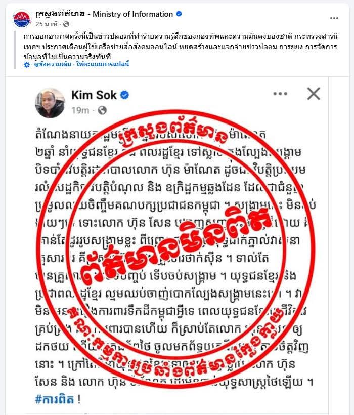 กระทรวงสารสนเทศของเขมร โพสบอกว่า โพสของอินฟลูคนนี้ เป็นเฟคนิวส์ และเป็นการบ่อนทำลายชาติ