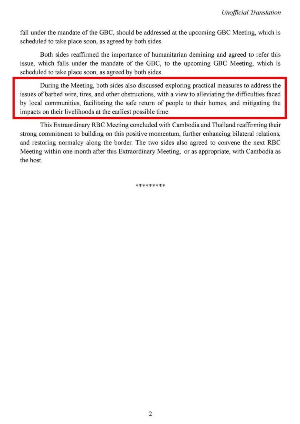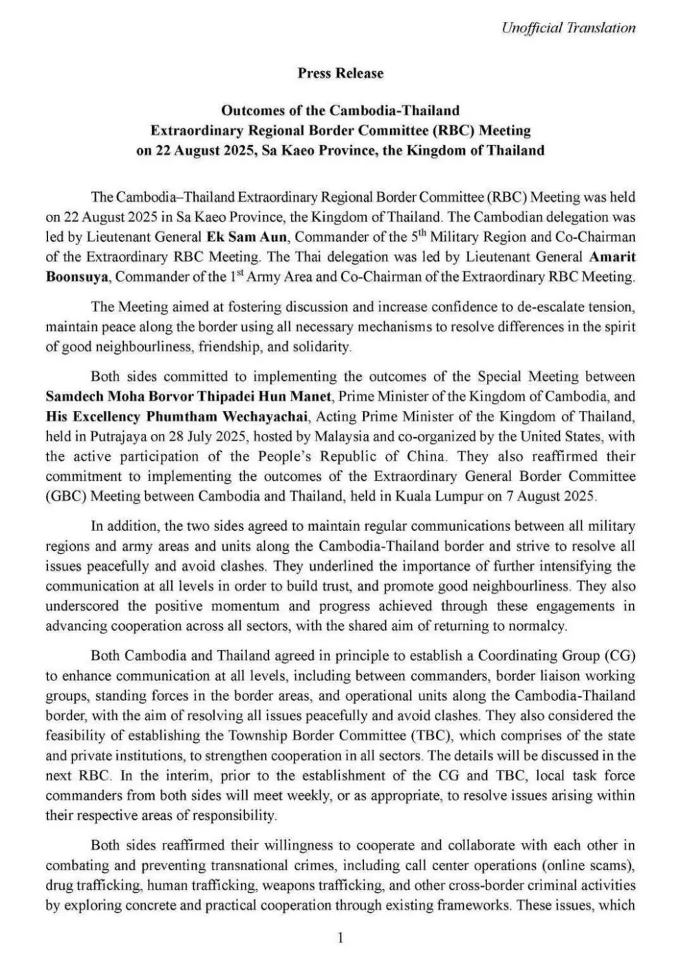 ตามที่ปรากฏในข่าวเผยแพร่เกี่ยวกับผลสำเร็จของการเจรจาระหว่างกัมพูชาและไทย ภายหลังจากการประชุมคณะกรรมการชายแดนส่วนภูมิภาค (Regional Border Committee: RBC) เมื่อวันที่ 22 สิงหาคม 2568 ณ จังหวัดสระแก้ว ประเทศไทย โดยกองทัพภูมิภาคที่ 5 ของราชอาณาจักรกัมพูชา ซึ่งในเอกสารฉบับภาษาอังกฤษที่ฝ่ายกัมพูชาเผยแพร่ มีข้อความบางตอนที่เกี่ยวข้องกับประเด็นว่า