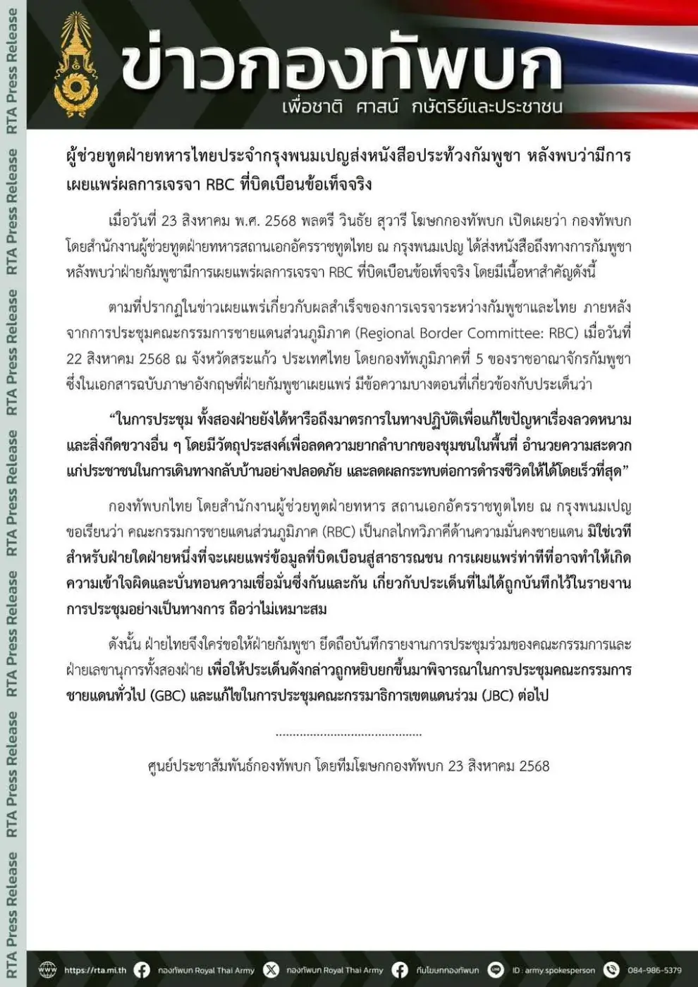 เมื่อวันที่ 23 สิงหาคม พ.ศ. 2568 พลตรี วินธัย สุวารี โฆษกกองทัพบก เปิดเผยว่า กองทัพบก โดยสำนักงานผู้ช่วยทูตฝ่ายทหารสถานเอกอัครราชทูตไทย ณ กรุงพนมเปญ ได้ส่งหนังสือถึงทางการกัมพูชา หลังพบว่าฝ่ายกัมพูชามีการเผยแพร่ผลการเจรจา RBC ที่บิดเบือนข้อเท็จจริง โดยมีเนื้อหาสำคัญดังนี้